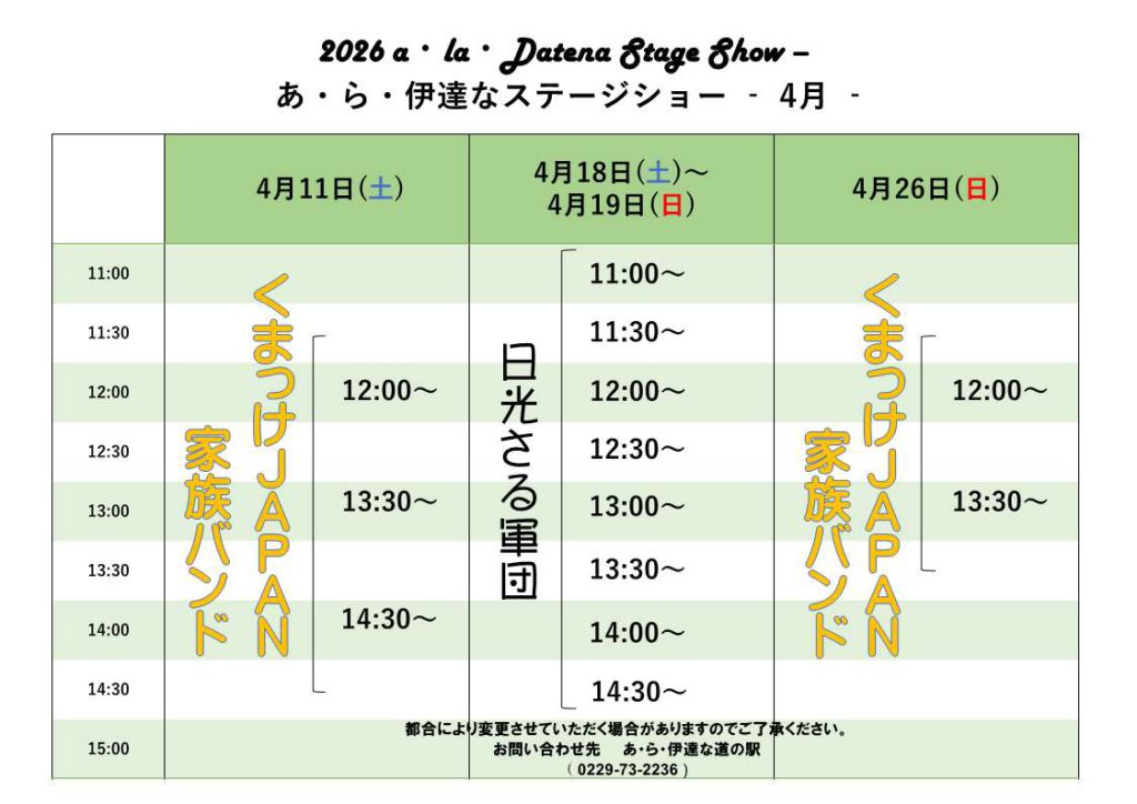 あ・ら・伊達な道の駅では、週末のお楽しみとしてステージイベントを開催しております。